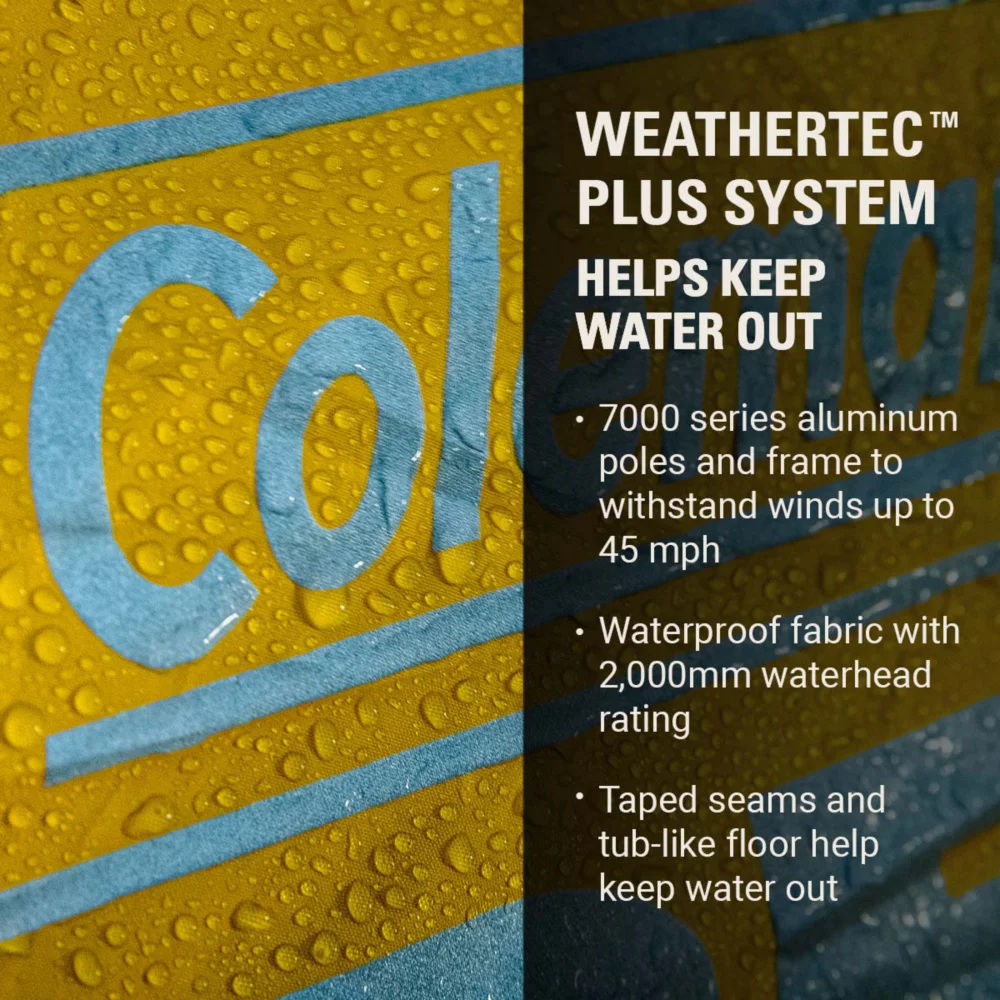 - BLOCKS WIND AND RAIN: WeatherTec™ Plus system has 7000 series aluminum poles and frame to withstand winds up to 45 mph; waterproof fabric with 2,000mm waterhead rating, taped seams to help keep water out, and a tub-like floor