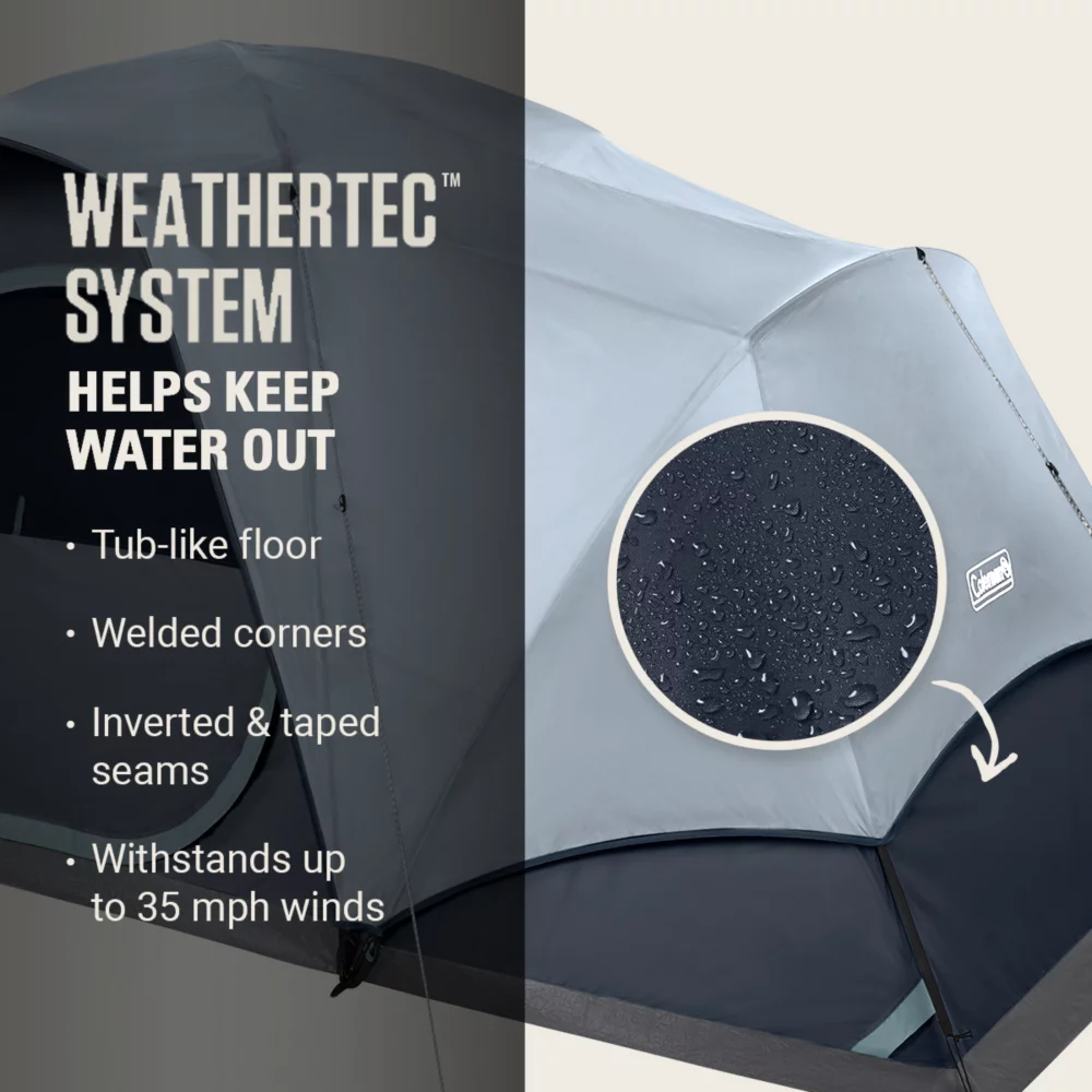 - BLOCKS WIND AND RAIN: WeatherTec™ system’s tub-like floor, welded corners, inverted seams and taped seams on rainfly and tent body help keep water from getting in; strong frame has been tested to withstand up to 35 mph winds